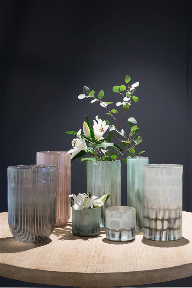 Aufwendige Handwerkskunst kennzeichnet die Glasvase STRIPES, deren Streifenstruktur dadurch entsteht, dass in aufwendiger Handarbeit Rillen in die Vase geschliffen werden. Die hübsche, elegante Farbgebung erhält das Glasgefäß danach durch einen schrittweisen Farbauftrag der unterschiedlichen Farb- und Metallictöne.